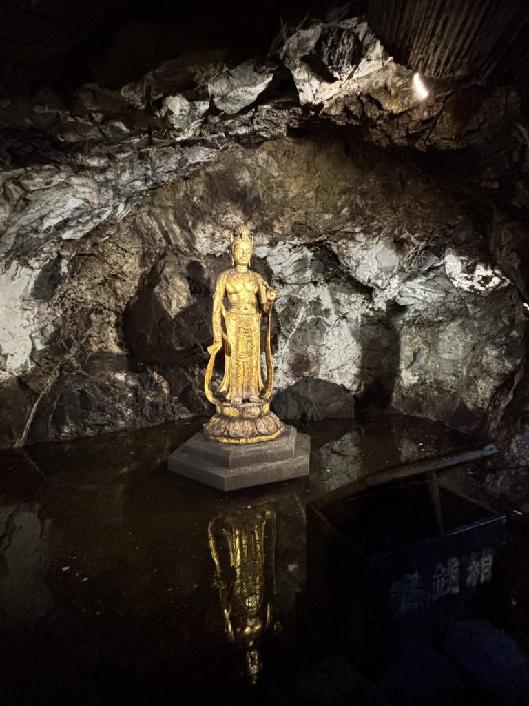トロッコツアーの最終地点は、金の観音菩薩像。串木野金山時代に鉱山で働く人達の安全と繁栄を願って作られたそうです。太平洋戦争により一度は没収されたようですが、戦後新たに建設され薩摩金山蔵にて貯蔵される焼酎や訪れる人々を見守ってくれています。
