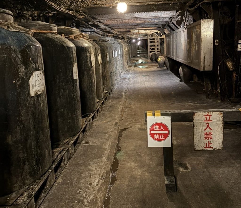 トロッコを降りて、坑洞内を進みます。ほんとう、涼しい!紫外線が一切入らず、年間を通して19度前後とのことですが、体感はもっと涼しいです。半袖でも寒いな..と感じました。この環境が、焼酎の熟成に適しているのでしょうね~!