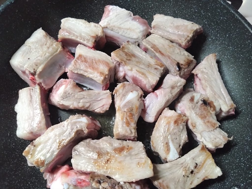 しっかり焼いたら、ザルにあげて熱湯をかけて、ショウガとともに圧力鍋へ。
