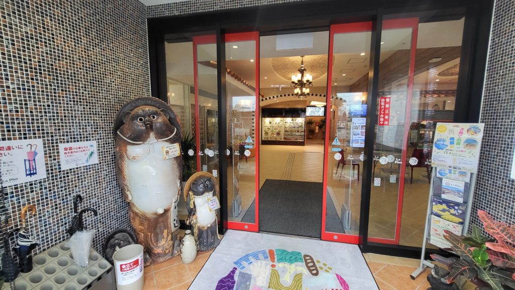 本部の入口にはたぬきの置物が鎮座しています。