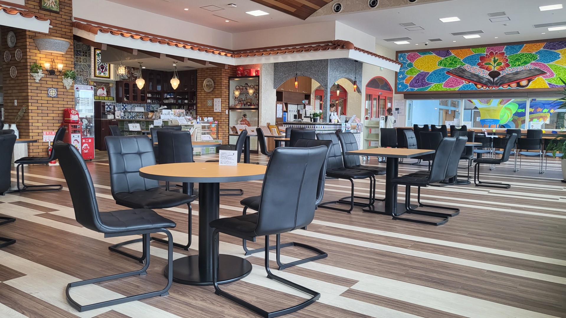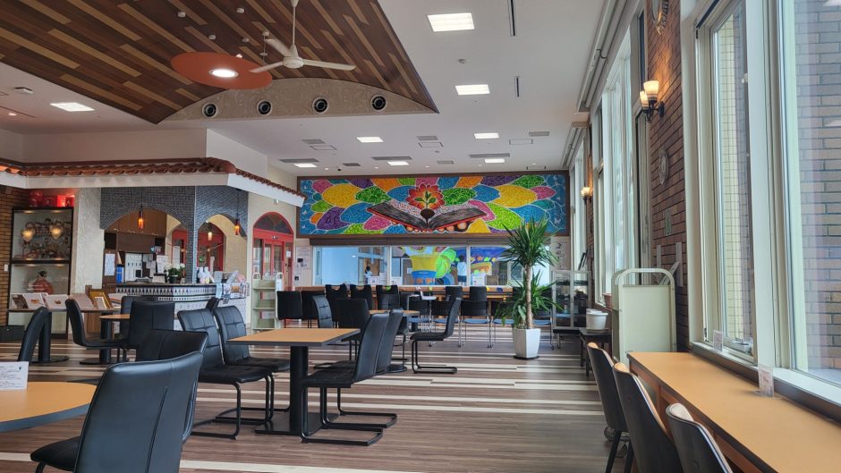 例えば、1階のカフェでご飯を食べることもできますし、パン屋さんでパンを買ってきて、食べられます。