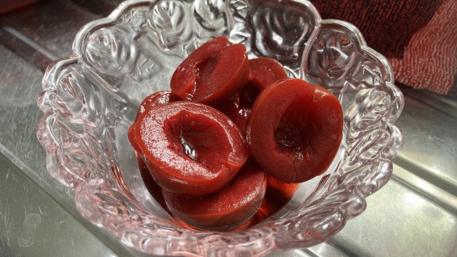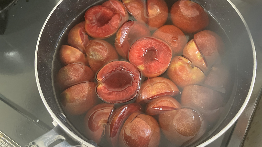 2分後すももを鍋に入れすぐ火からおろし、氷水で鍋ごと冷やします。
