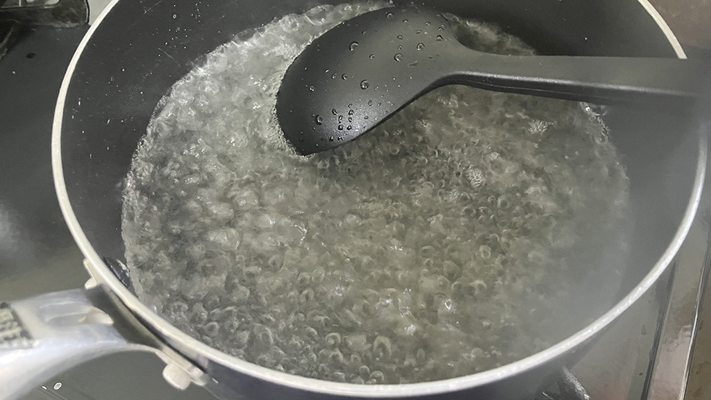 水、白ワイン、グラニュー糖を鍋へ入れ火にかけます。沸騰したら2分ほど白ワインのアルコールを飛ばします。