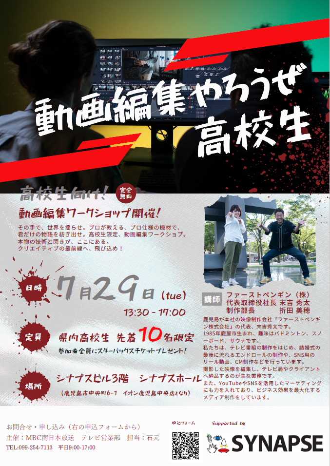 プロから動画づくりのコツを学んだり同じく鹿児島県下でクリエイティビティな高校生同士の交流ができたりしますので夏休みにぜひ参加してほしいです!