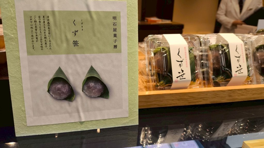 半透明のくずにあんこが包まれ、さらに笹の葉でくるまれていて、見た目も涼やか。
