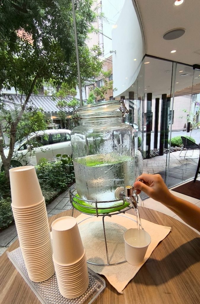 入り口近くにセルフのお水コーナーがあり、気軽に使えて便利です。