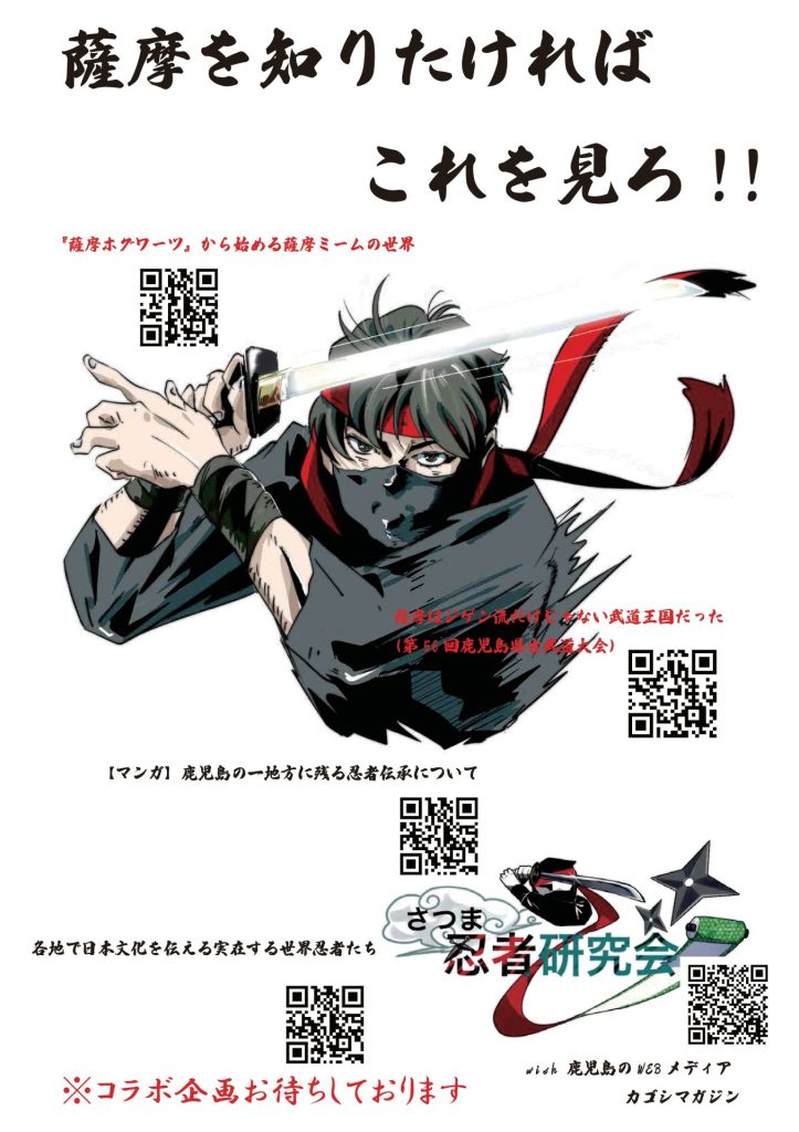 さつま忍者研究会でもチラシの配布やポスターの掲示をお願いしているので、ぜひ立ち寄ってみて下さい。チラシ類に掲載したQRコードには鹿児島のご当地WEBマガジン『カゴシマガジン』に寄稿した主に忍者関連の記事をリンクしていますので、創作ネタを探している作家さんには特にチェックしていただきたいです。