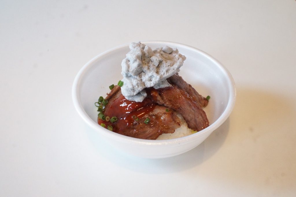 実は、鹿児島ユナイテッドFCのスタジアムグルメでも梶屋牛を食べることができます。「桜島 梶屋牛ステーキ丼」は、梶屋牛を使用したステーキに、チリソースと竹炭パウダーを使ったエスプーマで“桜島”を表現した一皿です。鹿児島ユナイテッドFCの試合を観に行かれた際は、ぜひご賞味ください。