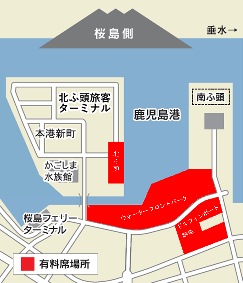 北ふ頭側有料席は指定席、ウォーターフロントパーク側有料席は指定席&自由席となっております。ウォーターフロント側はグレードによってはシートやいすを持ち込みましょう。