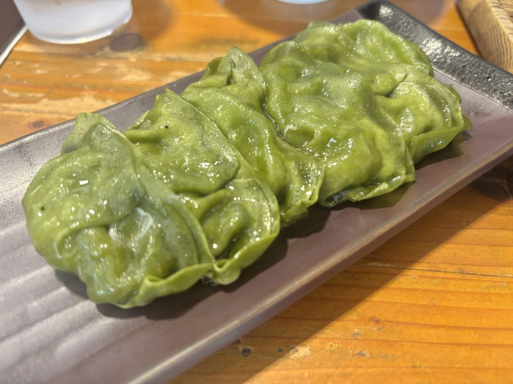 お茶によって緑色に染まる餃子というのは珍しいですね。