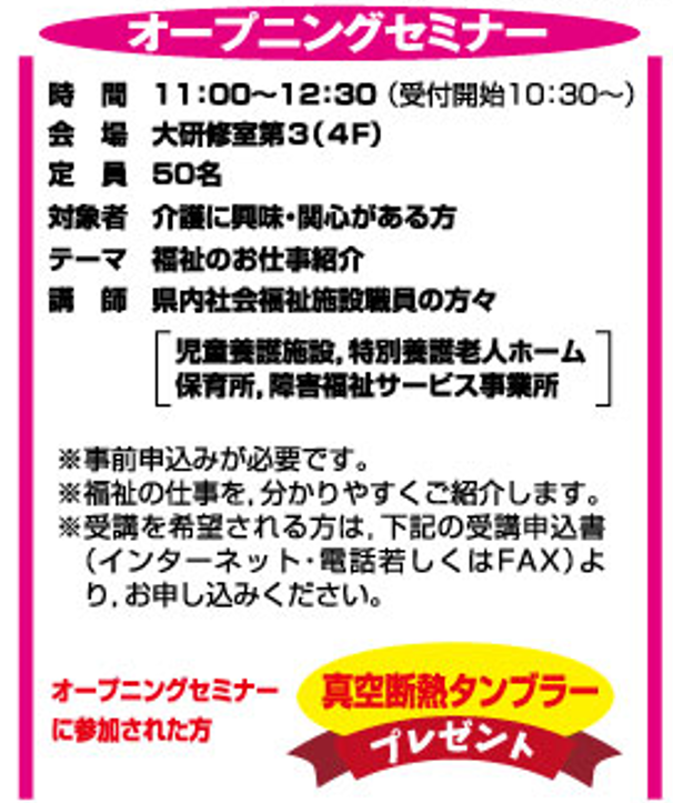 将来福祉や保健医療の仕事に就きたいな~と思っていらっしゃる学生さん、転職を考えていらっしゃる社会人の方、ぜひぜひご参加ください。