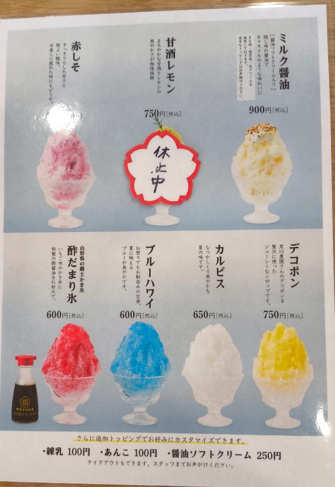 夏限定で登場。醤油を使ったシロップもあり、ここでしか味わえない。いろいろ美味しそう!