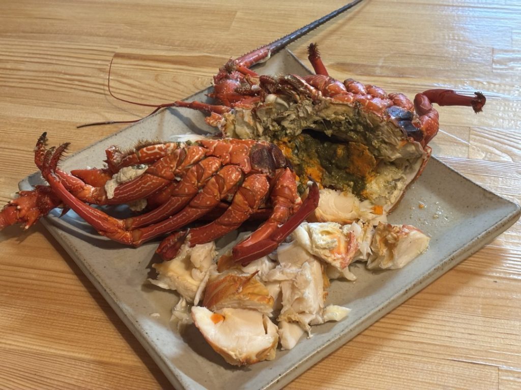 網にかかっても弱ってしまった伊勢海老は売り物にならないため、食卓へ直行!