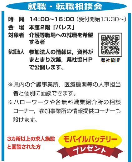 就職を希望される方が県内の介護等職場の人事担当者と気軽に相談できる場です。事前申込不要・入場無料・