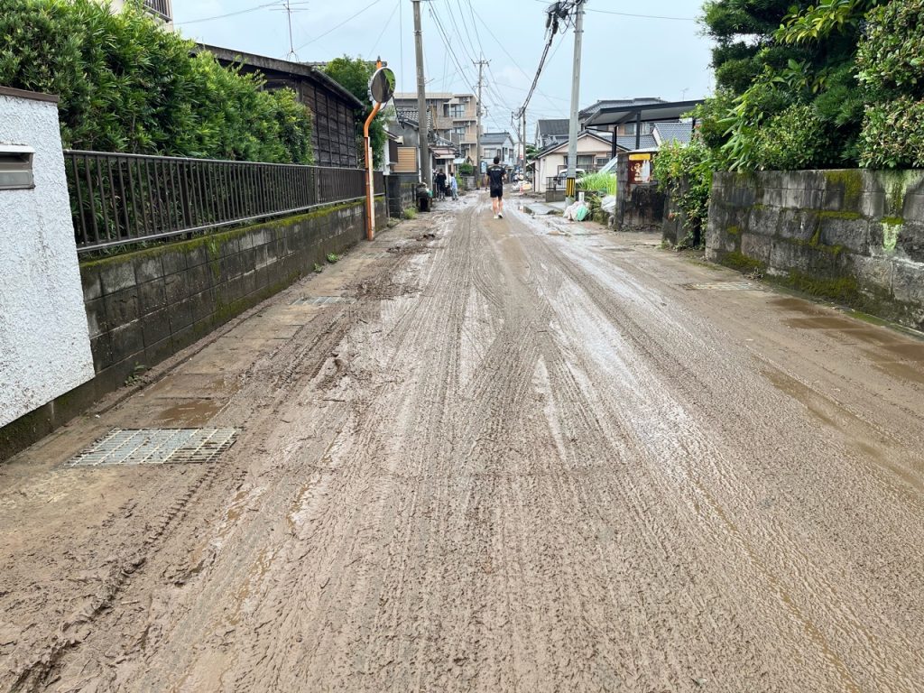 現地に着くと、見慣れた町並みは一変。泥に覆われた道路や、運び出される水没車が目に飛び込み、水害の恐ろしさを実感しました。お手伝いに集まった人々は、黙々と道路にたまった泥をスコップでかき出しています。しかし、一日だけの作業でどうにかなる状況ではありません。行政の支援体制が整うまでの間、誰かが動かなければならないのです。