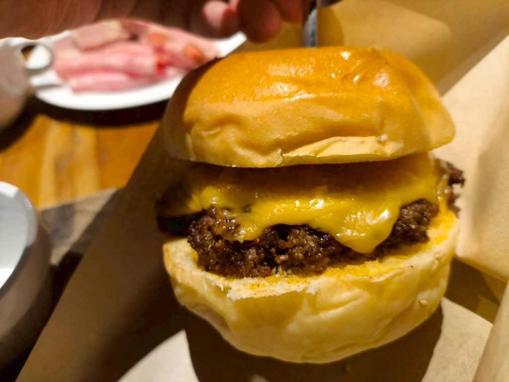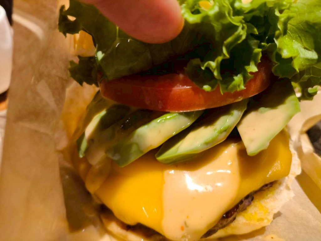 私はバーガーを包み紙に包んで、がぶりといただきました。大きいので食べるのが難しいほどです。少しぎゅぎゅっと潰していただきました。