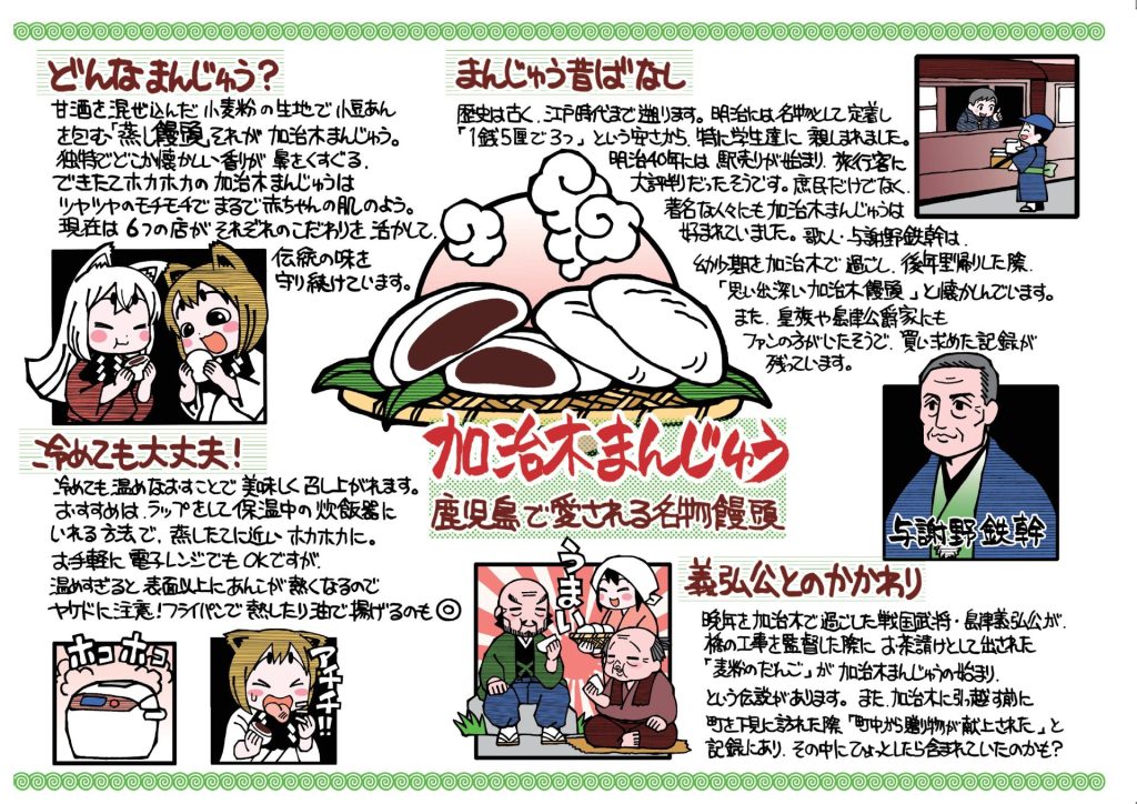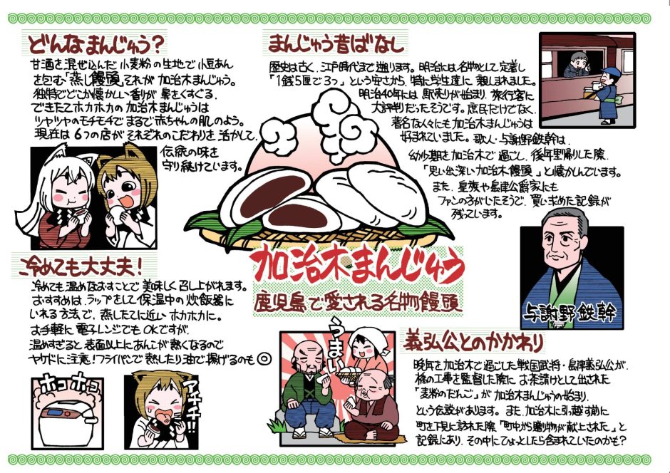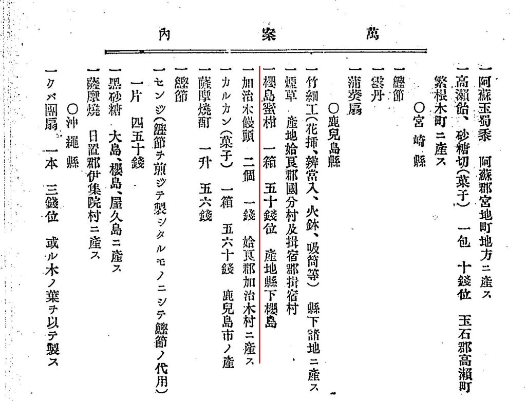 さらに1905(明治38)年の百科事典『内外百事便覧』では、全国の名産土産として鹿児島から10品が選出。桜島みかん、焼酎、かるかん、鰹節、薩摩焼といった今も有名な特産品の中に、加治木まんじゅうの名も堂々と並んでいます。