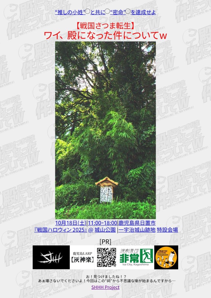 内容をざっくり説明しますと、戦国時代へ転生しちゃったアナタは超クセ強小姓たちに“島津義弘”に勘違いされる。が、自分以外にも“島津義弘”がいて「本物だったら我らとの“密命”の件、覚えてますよね?」って急な無茶振りイベント発生!?それら全てを制限時間内に達成し、無事現世へ戻ることが出来るのか!?ノンストップ!ドタバタ軍議系・転生ミッションコメディ!←甲冑着たお侍さんとアナタで行う生身のロールプレイングゲームですw