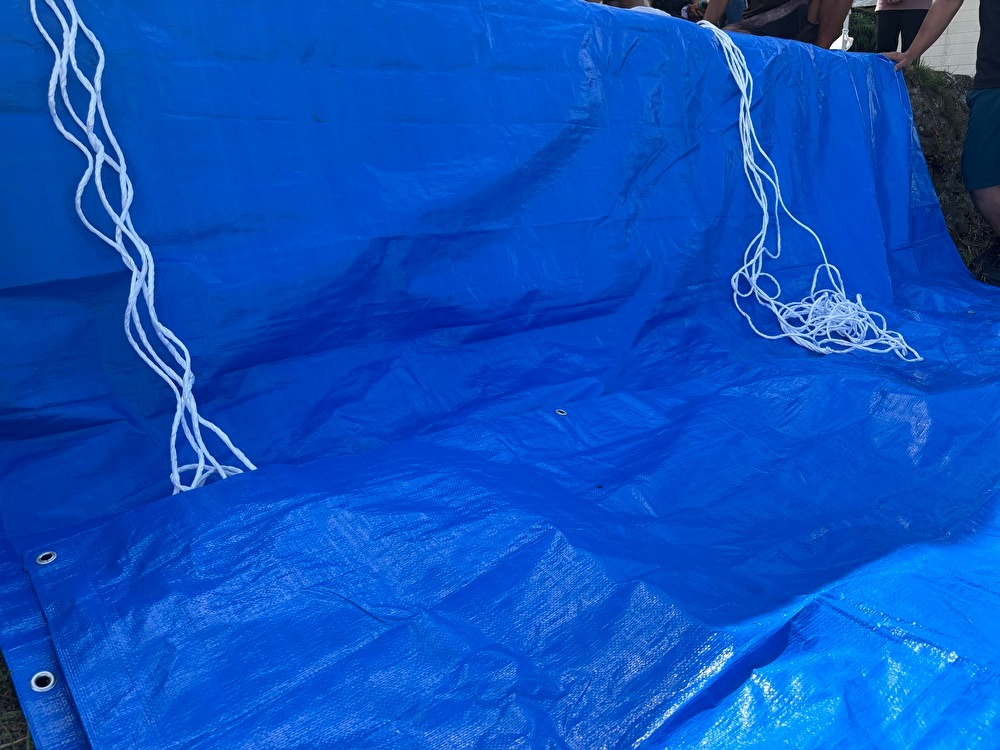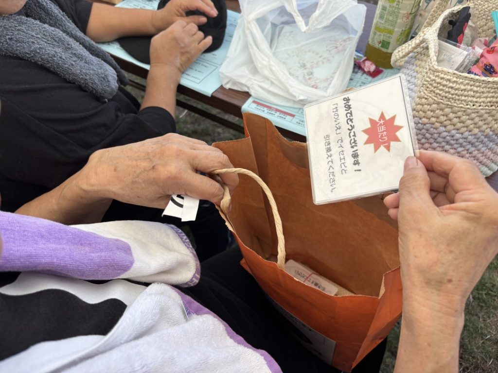 今年は午後からの開催なので暑いから校庭まで出てもらうのが大変…ってことで、テントの中で釣りではなく紐を引くスタイルになりました。