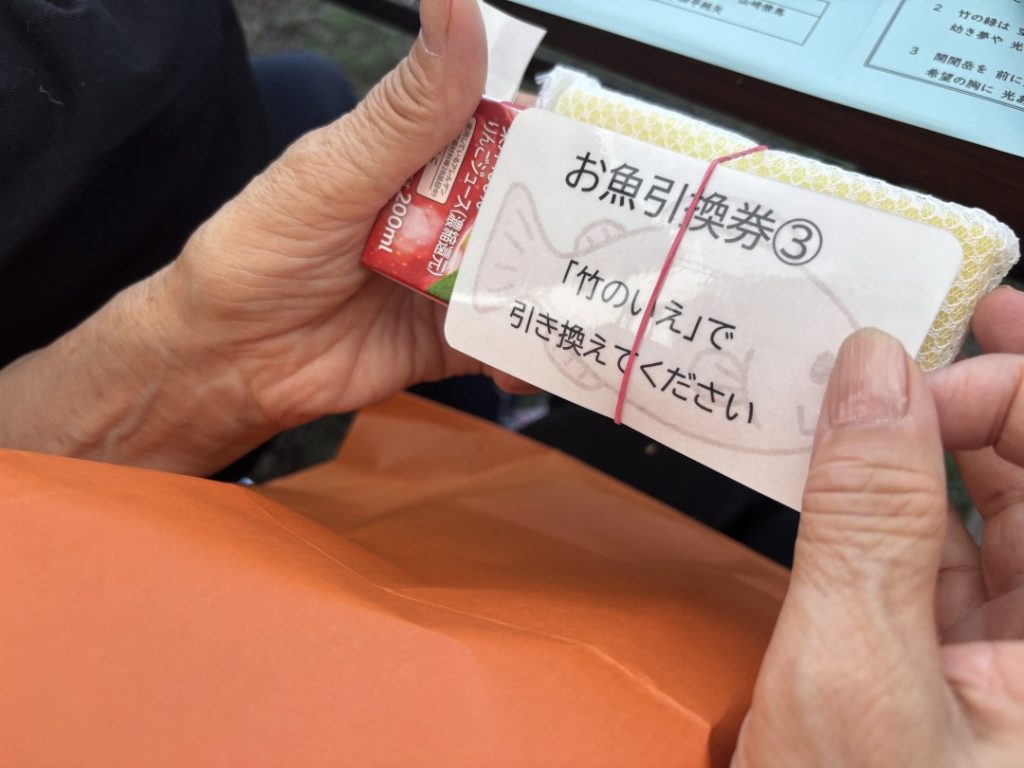 竹のいえに引換券を持っていくと、魚と交換できます。