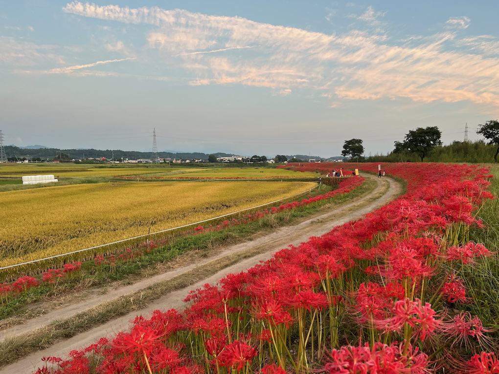 田んぼ土手が真っ赤な花で埋め尽くされ、まさに圧巻!