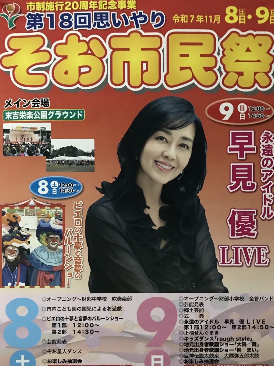 - 毎年、豪華なゲストが来てくれるそお市民祭。今年は【早見 優】さん!!が9日のゲストに。永遠のアイドル 早見優LIVEは、第一部と第二部の2回行われる。