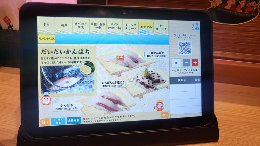 食べたいお寿司の写真をタップし、個数を選んで、注文ボタンを押したら注文完了です。