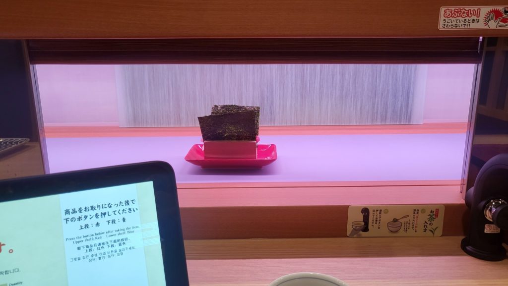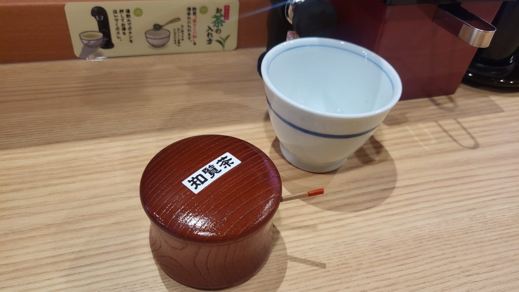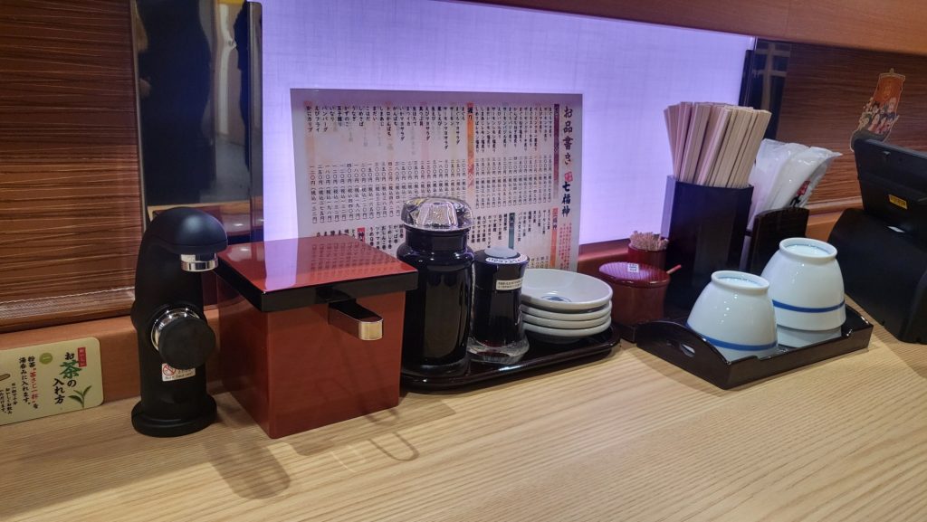 席には、お湯、ガリ、しょうゆ、しょうゆ皿、お茶の粉、割りばし、湯飲み、おしぼり、そしてメニューが完備されています。