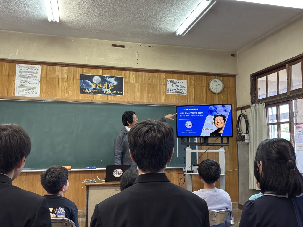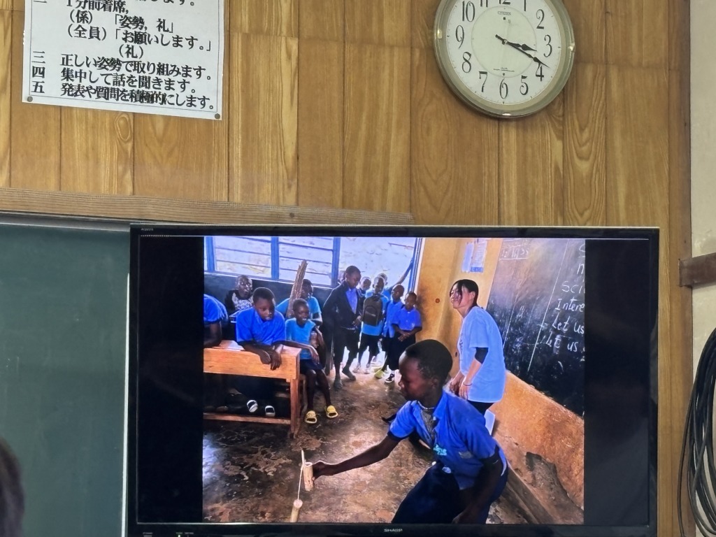 今回の授業では中村さんが見てきた世界を紹介しながら、「世界に届いた三島竹島の想い」として、たけのこやハマギ餃子、そして手作りの竹けん玉をシリアやルワンダの子どもたちの元へ届けた様子についてお話してくださいました。