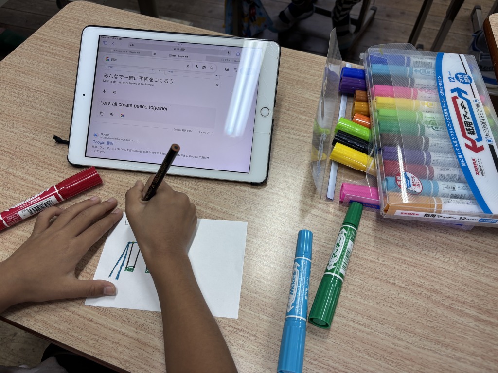 中村さんに「英語で書いてね!」と言われた子どもたち、ためらうことなくタブレットを開いて翻訳サイトを使いこなしています。