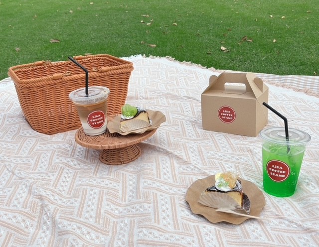 人数分のドリンクとスイーツで1500円以上購入すると、無料でレンタルできるピクニックセット(バスケット・小さなテーブル・紙皿とフォーク人数分・大きなレジャーシート2枚)を近くのみなと大通り公園で利用しました。紅はるかを使ったスイートポテトバスクチーズケーキは、なめらかな食感と、甘みの強い紅はるかのバランスが合っていて美味しく、外でリラックスして食べることができました♪