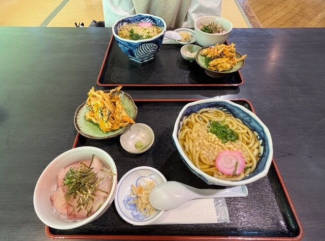 桜島小みかんを使ったうどんは麺がもちもちで、ほのかに小みかんの風味が漂い、ボリューム満点でした。カンパチ丼は、食べやすい量で新鮮なカンパチの上品な味わいが楽しめました。かき揚げも、カボチャなどの様々な野菜の甘みを感じ、とても美味しかったです。名前の通り、桜島の特産品をおなか一杯食べられて満足しました。