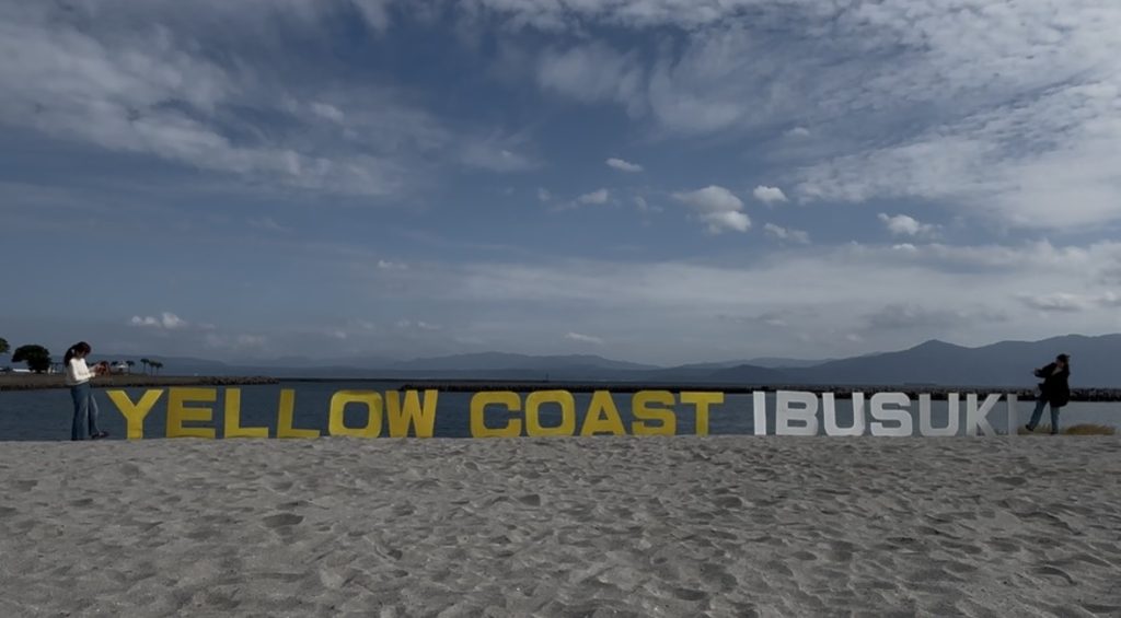 砂浜には「YELLOW COAST IBUSUKI」と書かれたオブジェがあり、写真映えも抜群でした。この名前は、世界的観光地オーストラリアのゴールドコーストを参考に、指宿のイメージカラーである黄色(YELLOW)と海岸(COAST)を組み合わせて作られた、指宿港海岸の新しい愛称です。