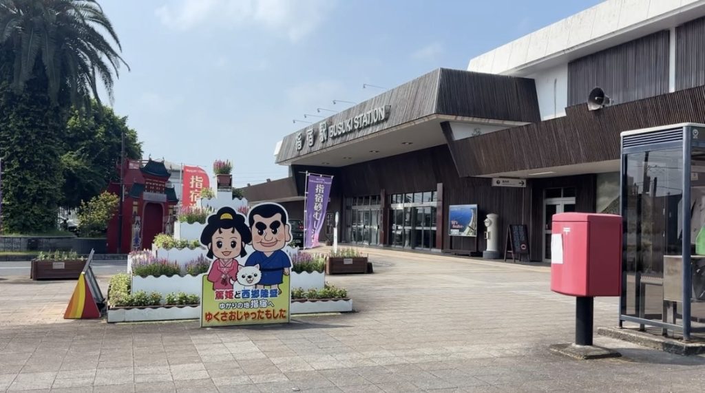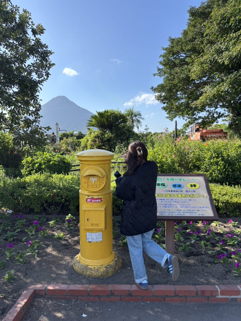 JR日本最南端の駅として知られる西大山駅は正面に大きな開聞岳を望む素晴らしい景観です。駅前には、指宿を代表する花・菜の花の黄色で、幸せを運ぶポストとして人気沸騰中です。また、「幸せの鐘(ベル)」や「旅の思い出ノート」も設置されているので旅の思い出に鳴らたりその時の気持ちを書いてみたりと楽しみ方はさまざまです。
