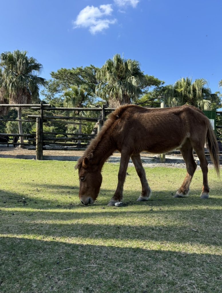 また、公園では鹿児島県の天然記念物に指定されている日本在来馬「トカラ馬」が放牧されており、間近で見られる迫力は本当にすごかったです。道路にも馬がいることがあるので、ゆっくり徐行しながら進むのが大事だと感じました。