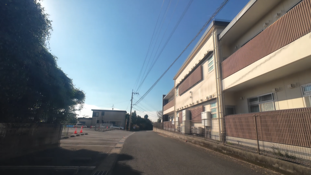 道なりに走ると、右に大きな建物、左手に駐車場が見えます。