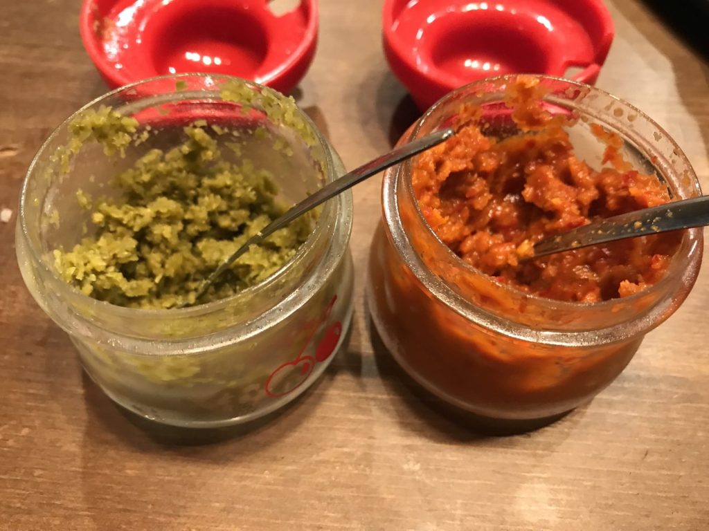 スパイスを、うどんにもお好みで加えると、味変で美味しい。特製タレは、鶏にも野菜にも合う。