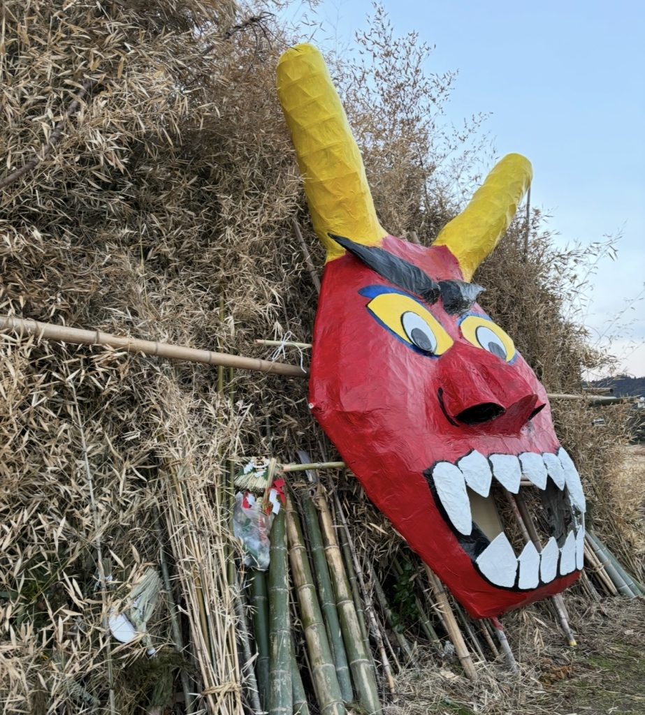 (このような鬼の面をつけるのは、おそらく山田地区の特徴。他の地区の鬼火炊きに参加した際は鬼の面はなかったように記憶しています。)
