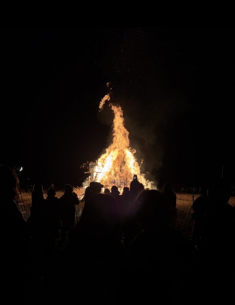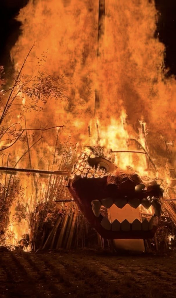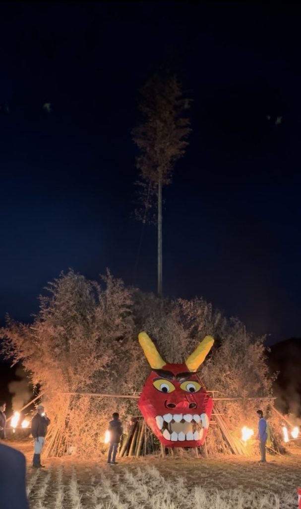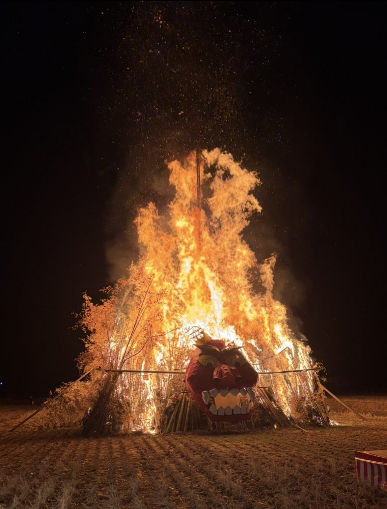 一度、火が灯ると一瞬で燃え広がります。組まれた竹と正月飾りが一気に赤く染まり、炎が音を立てて立ち上がっていきパチパチと乾いた竹がはぜる音がします。この、音と火の力で鬼を驚かせ、追い払う ということなのでしょう。