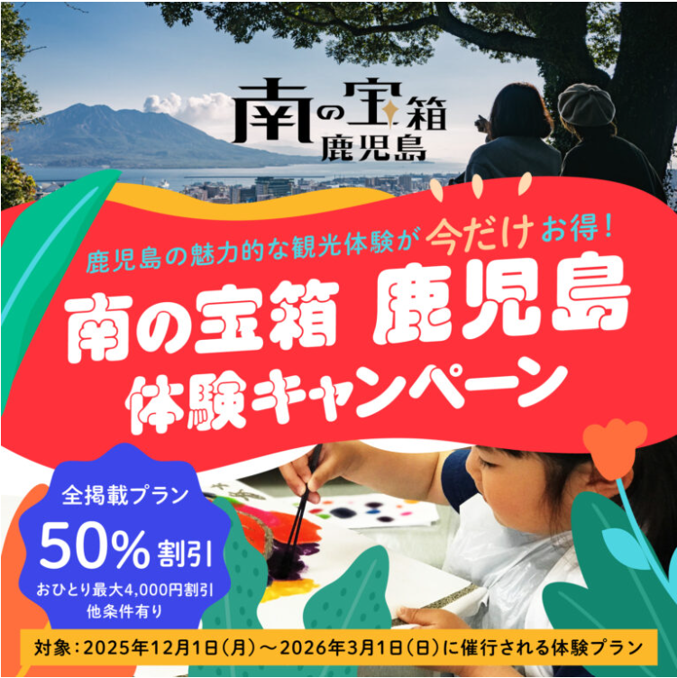 2025年もあっっっ!という間に最後の1日となりましたね。師走という言葉の通り、慌ただしい12月でしたが「鹿児島の魅力的な体験をお得に楽しめる」南の宝箱 鹿児島 キャンペーンが12月1日~スタートしています◎
