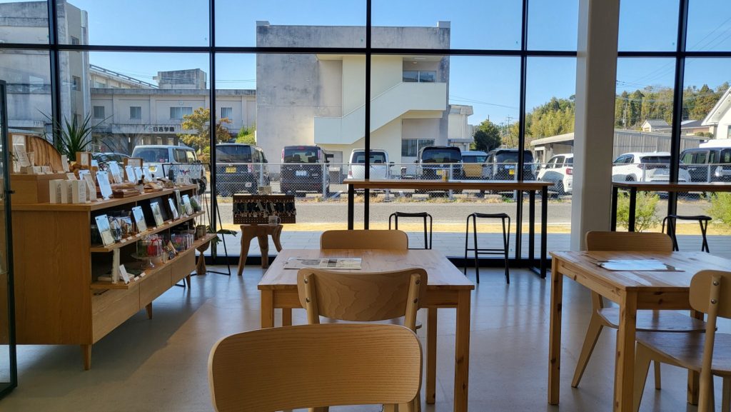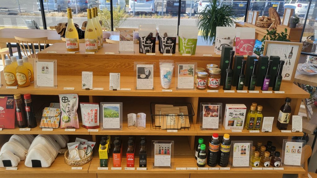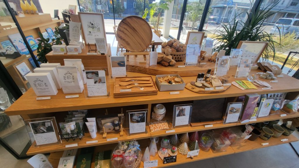 シェアスペースと喫茶室を区切っている棚には、ずらっと商品が並んでいます。