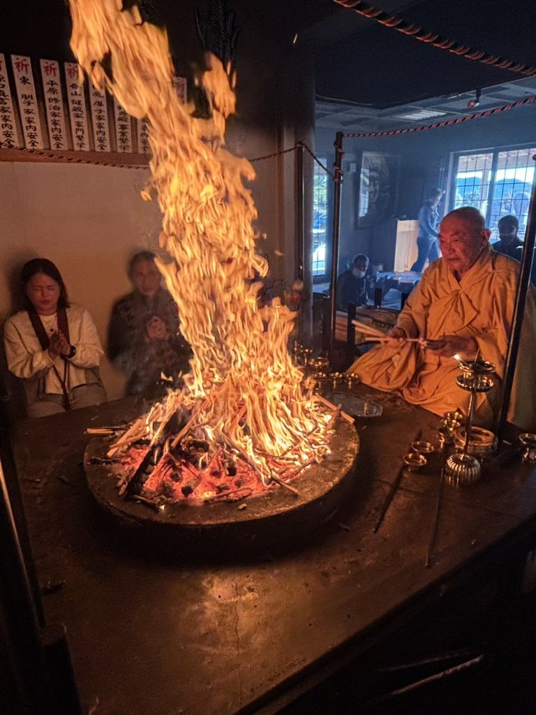 この寺で毎月1日、15日午前11時からおこなわれる護摩行では、一般の方も内陣(ないじん)と呼ばれる護摩壇の側まで行き、自ら護摩修行の体験をすることができる。手に印を結び、真言と呼ばれる呪文を唱え、心に不動明王を念じながら、囂々と燃え盛る炎の前で自らが書いた護摩木(願い事を書いた木札、300円)を目の前の火中に投じて一心に祈る姿は真剣そのもの。初心者には護摩行前に住職みずから丁寧にオリエンテーションが行われる。(初心者は午前10時集合、要・電話予約)