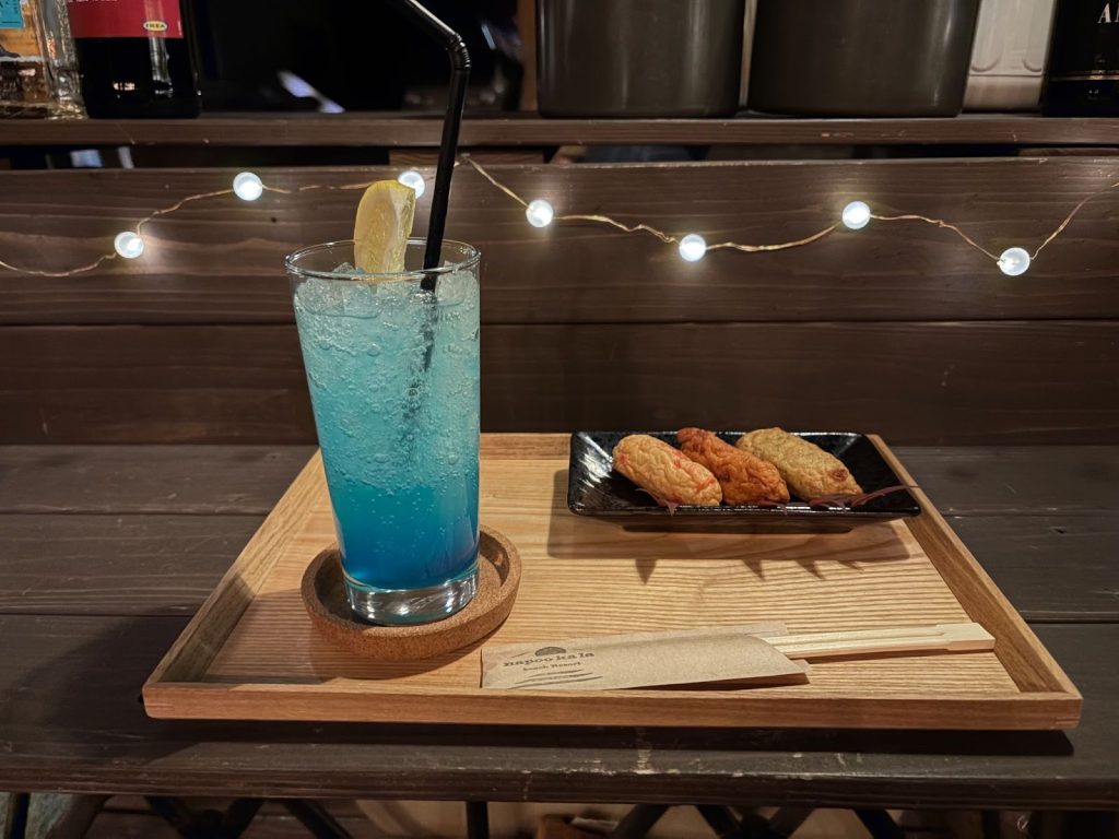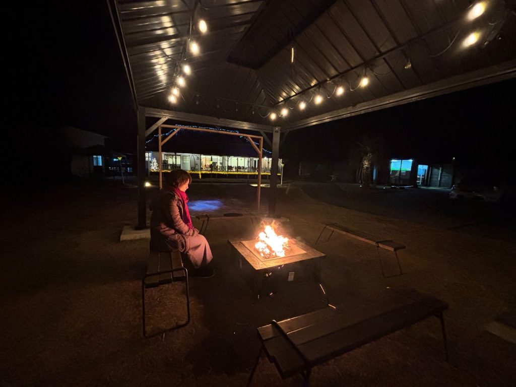 夜8時頃になると、敷地内の中央で焚き火が始まります。火を囲むと、自然と宿泊者が集まってくるから不思議ですよね。焚き火を囲みながら、気さくなスタッフとの会話を楽しんだり、ひとりでぼーっと炎を眺めたりと最高の時間が過ごせること間違いないです。焚き火のそばには簡易バーもあります。ドリンクだけでなく、マシュマロやさつまあげ3種付きのビールセットも頼めます。お酒が飲めない方は、ビールをノンアルコールカクテルに変更できますよ。