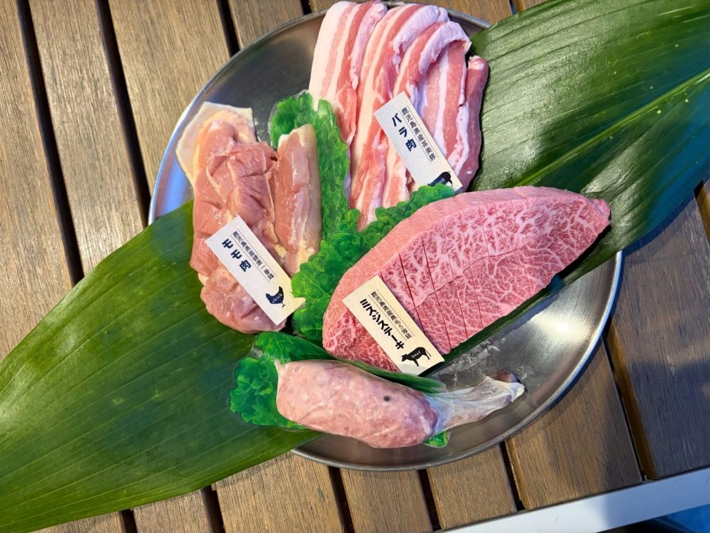 夕食は、鹿児島県産の食材を贅沢に味わえるBBQ。黒毛和牛5等級ミスジステーキをはじめ、茶美豚のバラ肉、健康一番鶏のモモ肉など、地元のお肉がずらりと並びます。「お肉の追加はできますか?」と聞かれることが多いそうですが、追加がいらないほどのボリューム感。特に、黒毛和牛5等級ミスジステーキの分厚さに、「これ一人で食べ切れる!?」と思ってしまったほど。