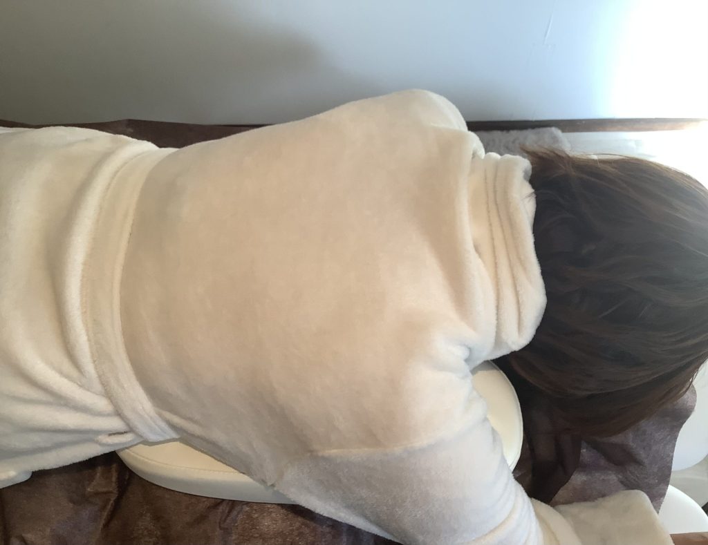 着替えを済ませ、いよいよ全身のオイルトリートメントへ。足先からお腹、背中、首、肩、頭、顔まで。椿油に包まれながら、リンパをゆっくりと流していきます。