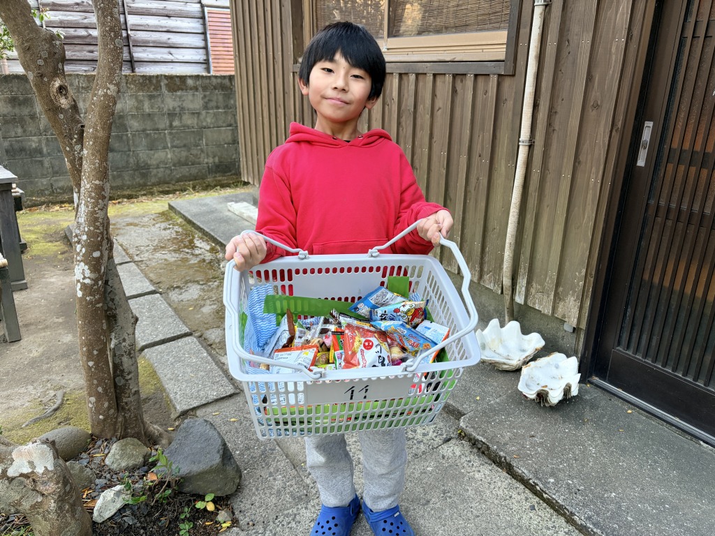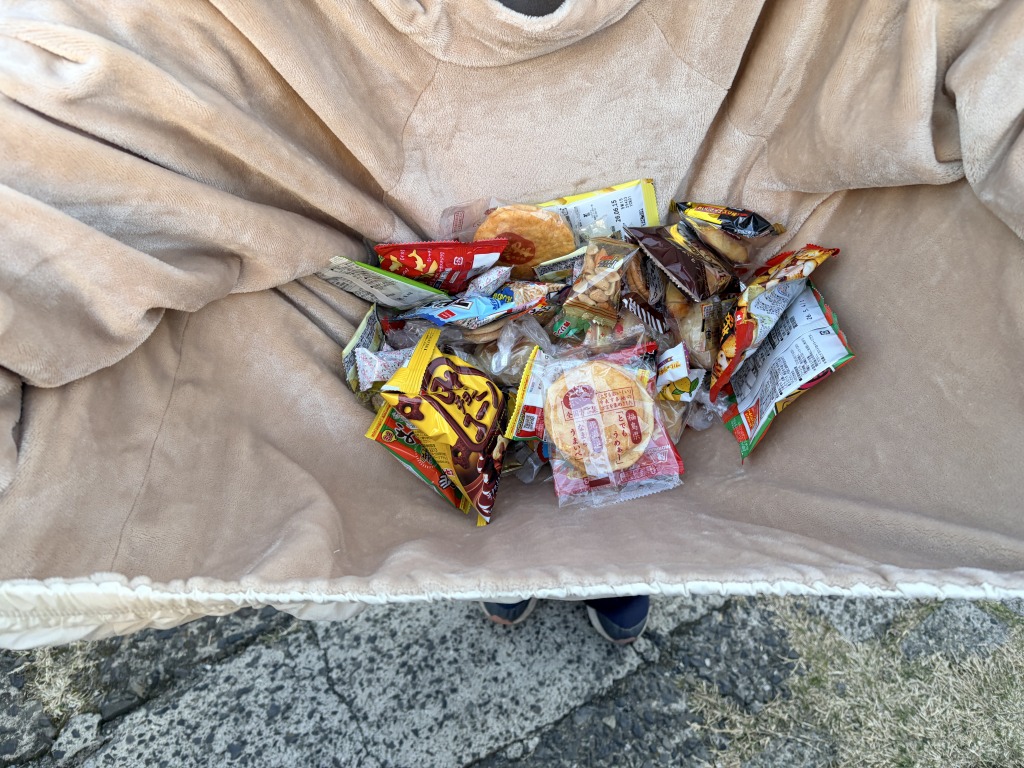 メインは、個包装になった飴やチョコレート、袋入りのスナックなど。それに、お金も。まるで棟上げのように、次から次へと空から降ってきます。