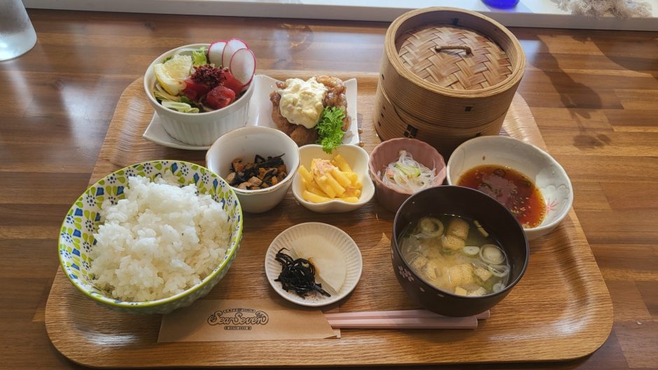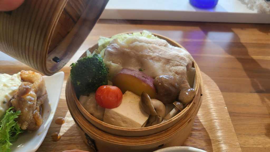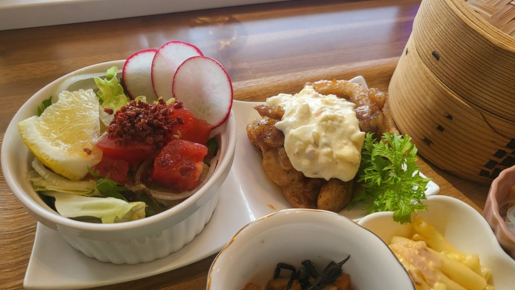 左上から、サラダ、メインのチキン南蛮、せいろ蒸し、副菜、ご飯、漬物、みそ汁、です。