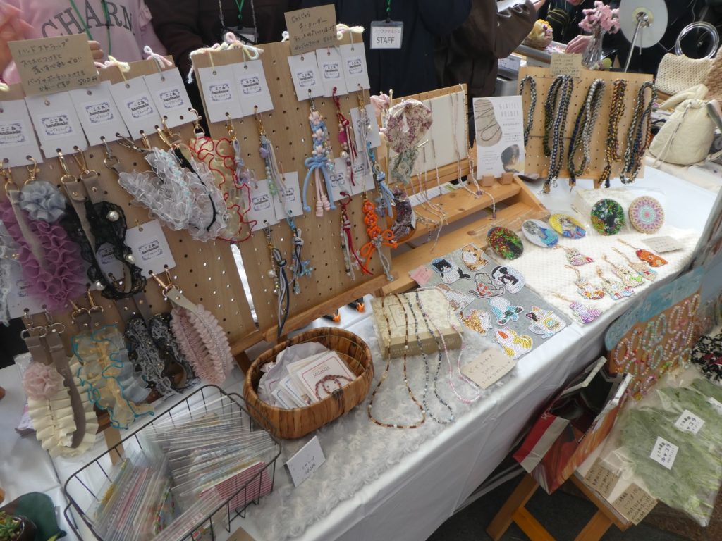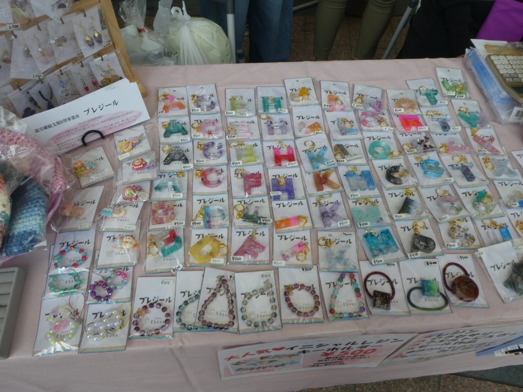 利用者さんが作られた、レジンやビーズアートが並んでいました。