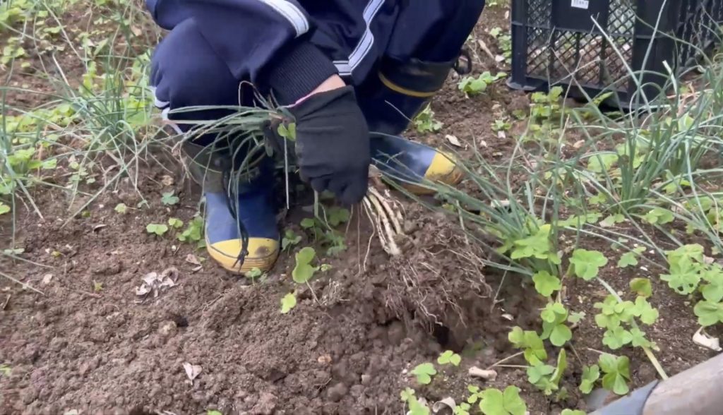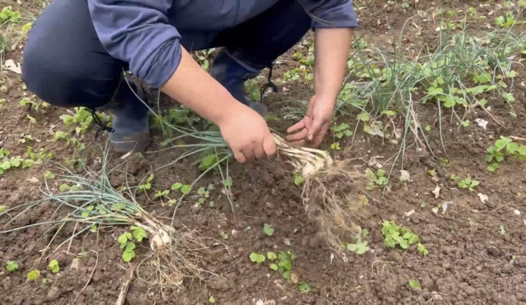 土の中から掘り起こされた、島らっきょう。
