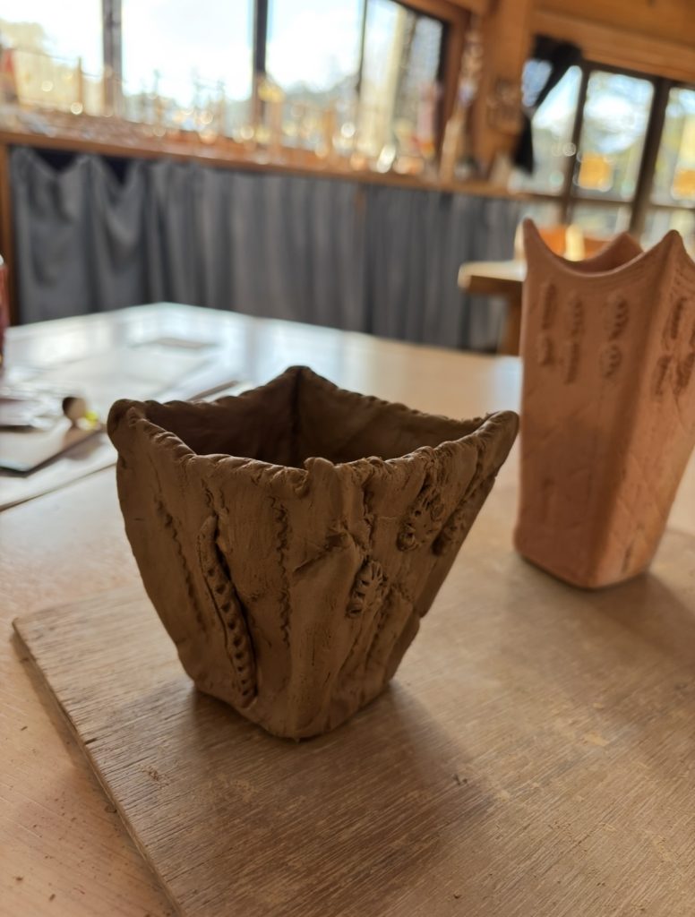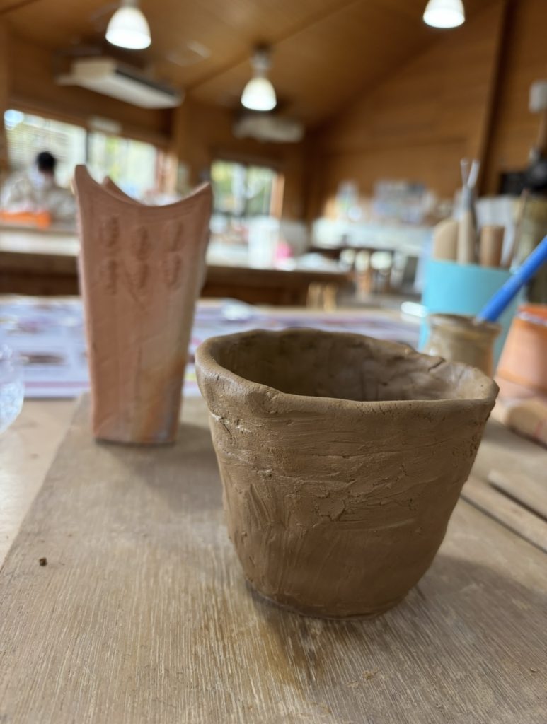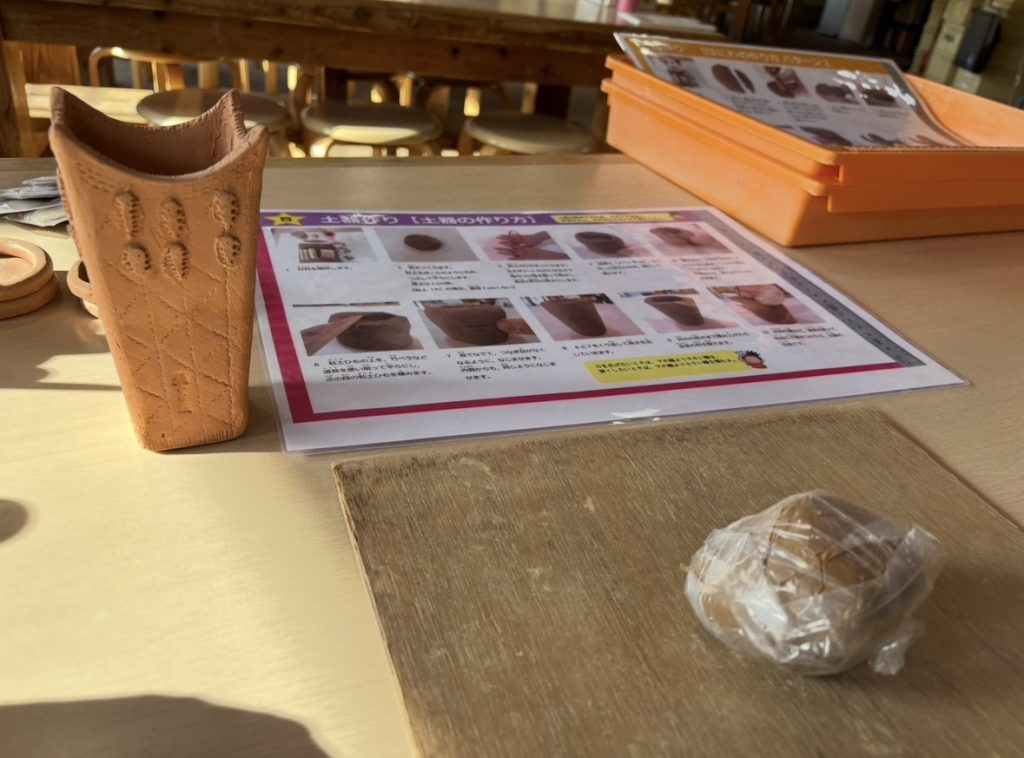 今回は、土器作りに挑戦しました。展示館で感銘を受けた「角筒形(かくとうけい)土器」をど~~うしても作りたくて。通常の円形の土器よりも角形のほうが難易度が高いそう。